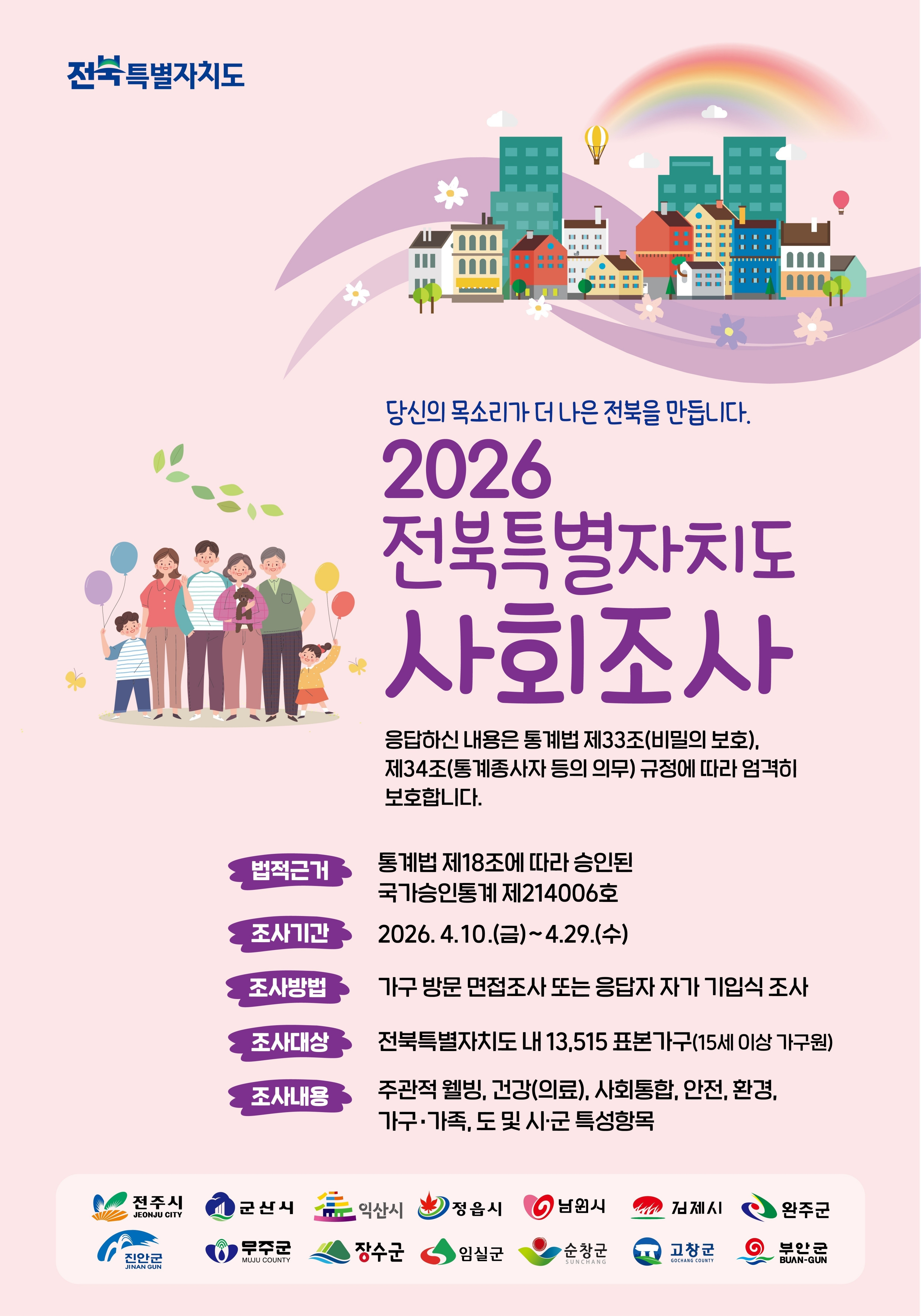 순창군은 오는 10일부터 29일까지 14일간 2026년 순창군 사회조사를 실시한다. ‘순창군 사회조사’는 전북특별자치도가 주관하고 순창군이 매년 공동으로 추진하는 통계 조사로, 군