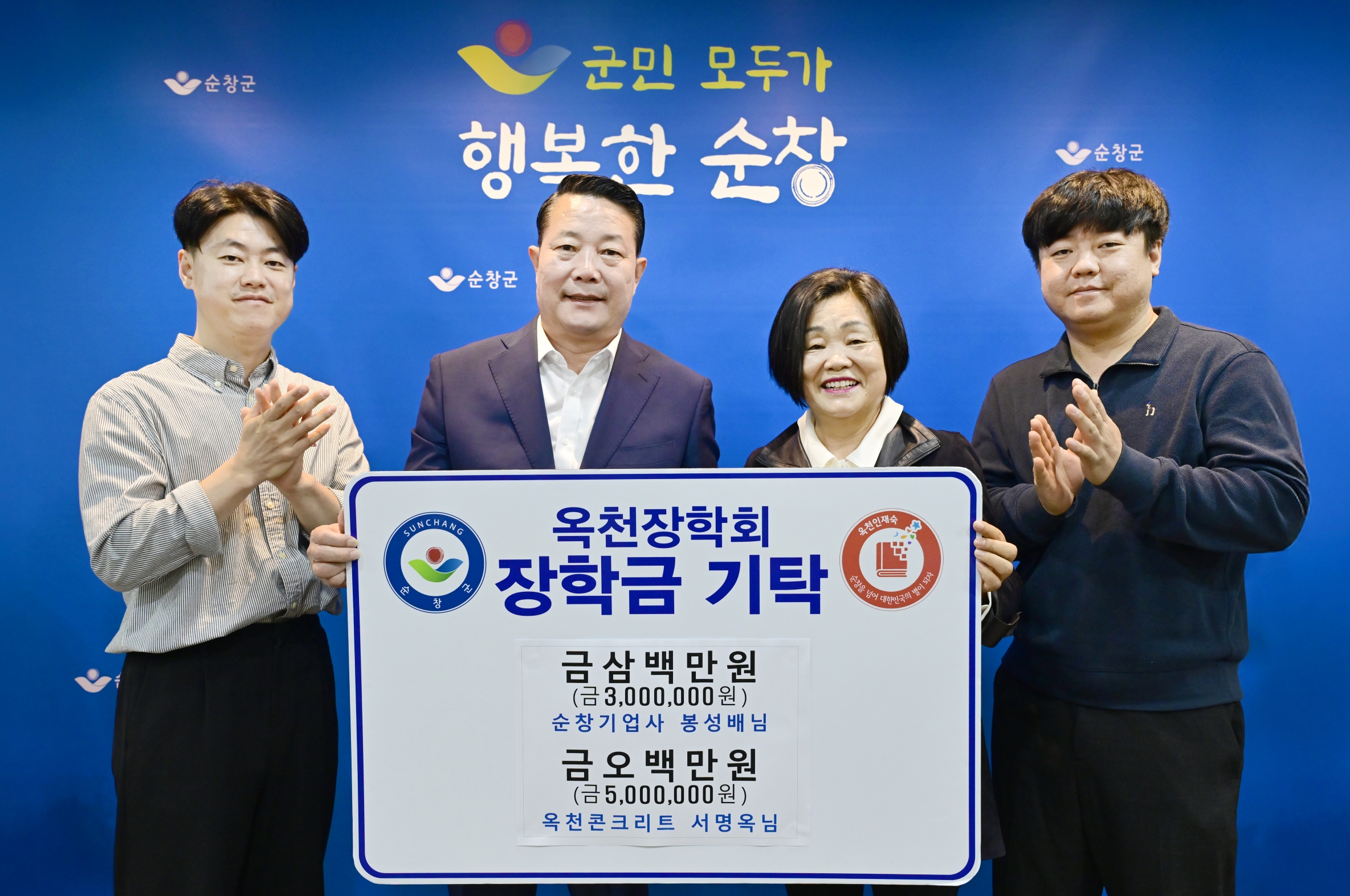 순창군은 6일 순창기업사(대표 봉성배)와 옥천콘크리트(대표 서명옥)가 (재)순창군옥천장학회에 지역인재 육성에 써달라며 장학금을 기탁했다고 밝혔다. 순창기업사는 건설·자재 분야에서