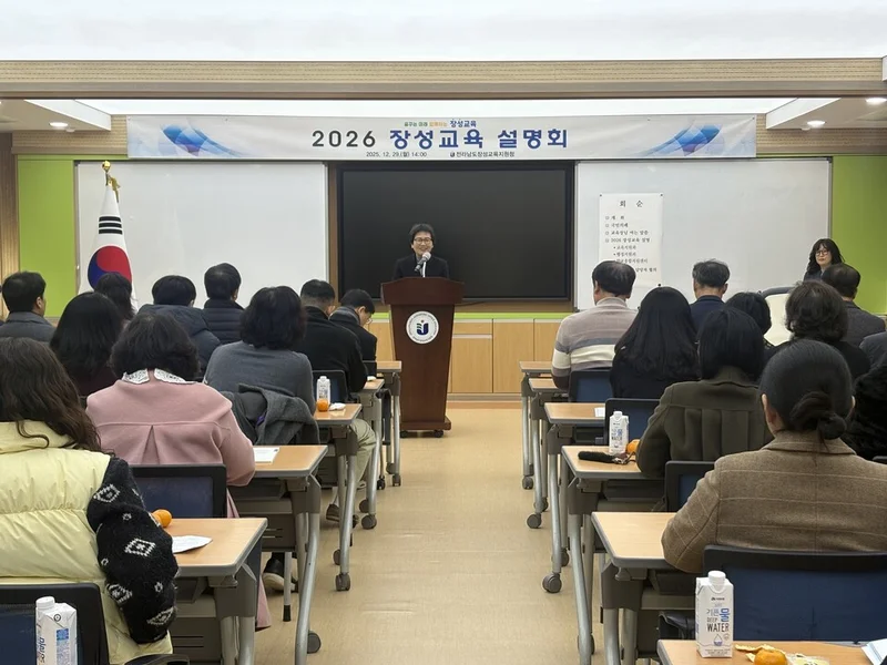 전라남도장성교육지원청은 12월 29일(월) 「2026 장성교육 주요업무계획 설명회」를 개최하였다. 이날 설명회에는 유·초·중·고 교원장, 행정실장, 학교교육계획 담당교사 등 총 8
