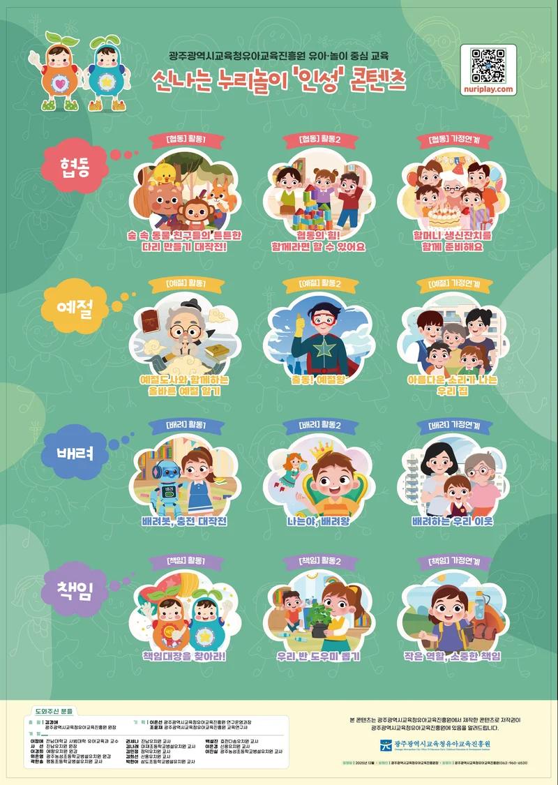 광주유아교육진흥원은 유아기 필수 덕목인 인성 가치를 함양하고, 유치원과 가정의 교육 연계를 강화해 유아들의 전인적 성장을 돕고자 제작된 콘텐츠가 개발됐다. 콘텐츠는 협동·예절·