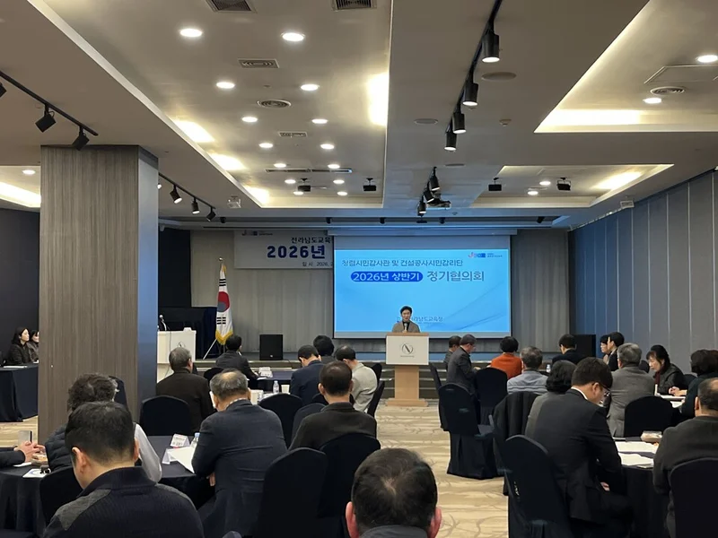 전라남도교육청(교육감 김대중)은 23일 나주에서 청렴시민감사관 및 건설공사 시민감리단 상반기 정기 협의회를 열고 2026년 활동 계획과 ‘청렴 전남교육’ 실현 방안을 논의했다. 전