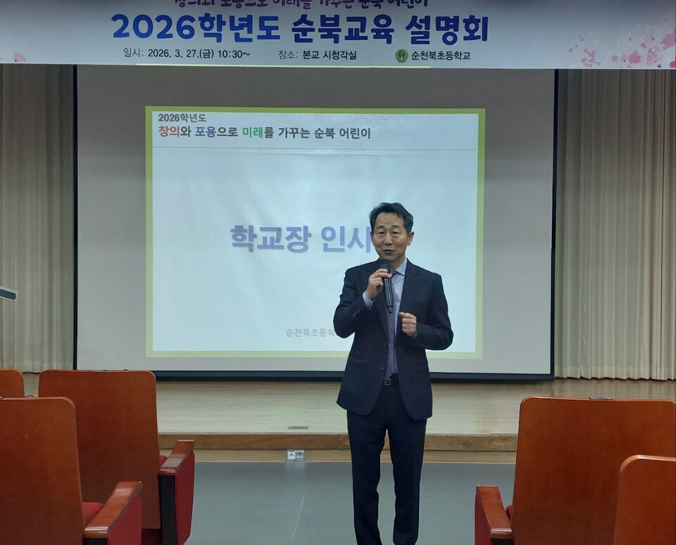 순천북초등학교(교장 장재수)는 지난 3월 27일(금) 오전 10시 30분부터 11시 30분까지 시청각실에서 ‘2026 순천북초등학교 교육 설명회 및 학교급식 공개 행사’를 개최했다
