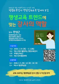 여수시는 오는 3월 5일 오후 2시, 여수시 평생학습관에서 ‘평생교육 트렌드에 맞는 강사의 역할’을 주제로 2026년 명품 평생학습도시 조성을 위한 평생교육강사 역량강화교육을 운영