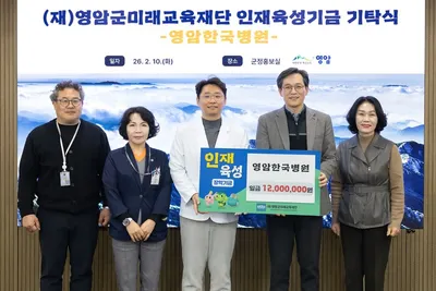 영암한국병원이 10일 영암군청을 찾아 영암군미래교육재단에 1,200만원의 장학기금을 기부했다. 이날 기부는 2022년 병원과 재단이 맺은 ‘내 고장 정착 희망 장학생 사업’ 협약의