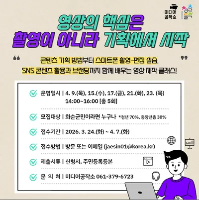 화순군 청년센터 미디어공작소, 영상 제작 교육 운영 화순군(군수 구복규)은 오는 4월 9일 오후 2시 화순군 청년센터(청춘들락) 미디어공작소에서 군민을 대상으로 영상 제작 교육을