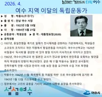 - 여수시는 2026년 4월의 독립운동가로 여수 서정 출신 ‘박용수(朴容守)’ 선생을 선정했다. 1937년, 중일전쟁을 계기로 일제가 전시체제를 강화하는 가운데에서도, 학생들은 소