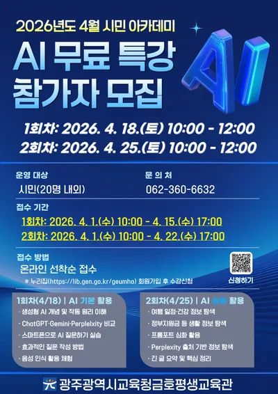 이번 프로그램은 시민들의 자기계발을 지원하기 위해 마련됐다. 프로그램은 운영 기간 매월 2차례(토요일) ▲AI 활용(4월) ▲생활법률(5월) ▲금융경제(6월) ▲저속노화 건강법(7