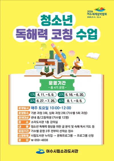 여수시는 오는 4월 11일부터 관내 중·고등학생을 대상으로 ‘청소년 독해력 코칭 수업’ 프로그램을 운영한다고 밝혔다. ‘청소년 독해력 코칭 수업’은 청소년의 독해력 향상을 위해 속