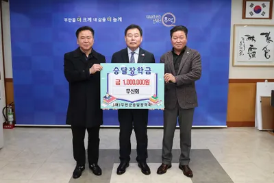 무안군(군수 김산)은 지난 1월 19일 무신회 박석현 회장이 지역 인재 육성을 지원하고자 (재)무안군승달장학회에 장학금 100만 원을 기탁했다고 밝혔다. 무신회는 무안군 관내 19