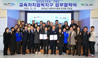 구례군은 전라남도교육청과 지난 19일 '구례교육자치협력지구' 업무협약을 체결했다. 2026년부터 2029년까지 4년간 총 28억 원을 공동 투자해 미래교육체제 구축 및 교육 생태계를 활성화할 계획이다.