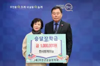 무안군, 한사랑케미칼 대표의 8년째 승달장학금 기탁 무안군(군수 김산)은 13일 한사랑케미칼 김순이 대표가 지역 인재 양성을 위해 (재)무안군승달장학회에 장학금 100만 원을 기탁
