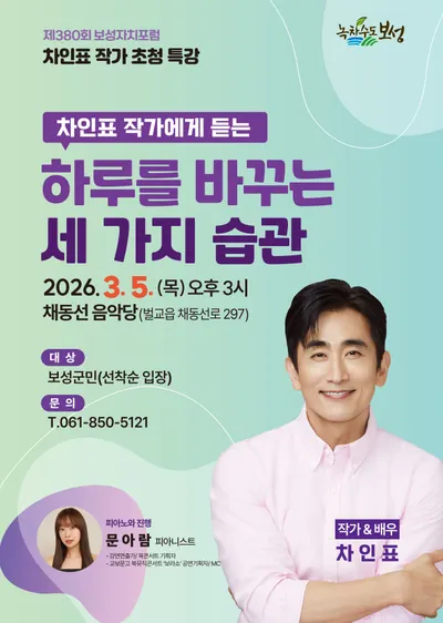 ‘사랑을 그대 품안에’ 차인표, 보성군민과 만난다 제380회 보성자치포럼, 3월 5일 채동선음악당에서 개최 보성군은 오는 3월 5일(목) 오후 3시, 채동선 음악당에서 국내 대표