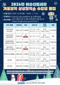 여수시는 12월 29일부터 2026년 1월 7일까지 ‘2026년 이순신도서관 겨울방학 상상창작소’ 수강생을 선착순 모집한다. 이번 프로그램은 관내 초등학생을 대상으로 하는 7개 강