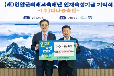 김종섭 ㈜다나농축산 대표가 11일 (재)영암군미래교육재단에 인재육성기금 2,000만원을 지정 기부했다. 특히, 기부금 절반인 1,000만원을 모교인 장천초등학교 학생들을 위해 써달