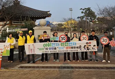 영암군이 12일 영암초등학교 일대에서 영암교육지원청, 영암경찰서, 모범운전자회 등과 ‘초등학교 개학기 위해 요소 안전 점검 및 단속’의 하나로 민·관·경 합동 캠페인을 열었다. 4