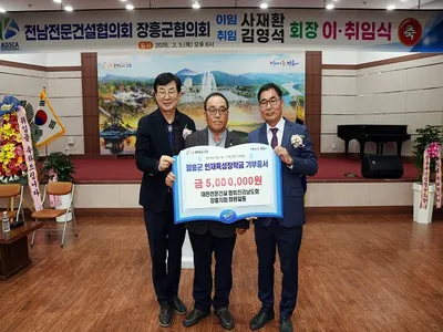 (재) 장흥군인재육성장학회는 대한전문건설협회 전라남도회 장흥지회 회원 일동이 지역 인재 육성을 위한 장학금 500만 원을 기부했다고 밝혔다. 이번 장학금 전달식은 지난 5일 장흥군