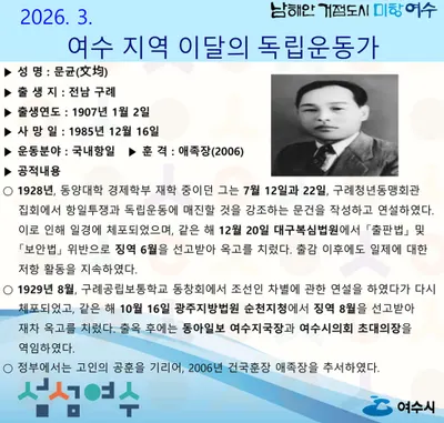 여수시는 2026년 3월의 독립운동가로 전남 구례 출신 ‘문균(文均)’ 선생을 선정했다. 1928년 동양대학 경제학부 재학 중이던 문균 선생은 7월 12일과 22일, 구례청년동맹회