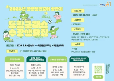 - 3월 16일 순차 개강, 판소리·홈베이킹 등 교류형 강좌 확대 - 광양청년꿈터(센터장 배혜금)는 지역 청년이 직접 기획하고 운영하는 청년 주도형 학습 프로그램 ‘2026년 상반