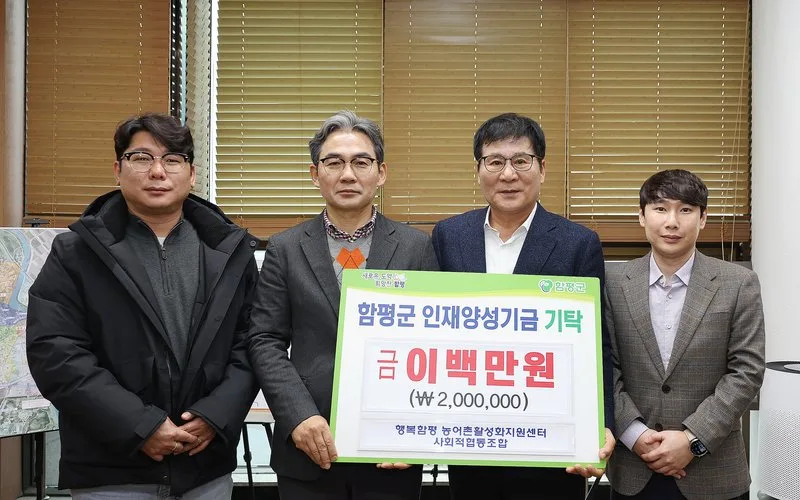 전남 함평군은 “지난 19일 행복함평 농어촌활성화지원센터 사회적협동조합(센터장 주진백)이 함평군 인재양성기금에 200만원을 기탁했다”고 20일 밝혔다.