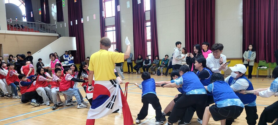 여는 마당에서는 지네발 걷기, 색카드 뒤집기, 대형컵 쌓기등의 청백게임과 학부모 경기가 펼쳐져 학생들과 학부모 모두가 함께 어우러지는 즐거운 분위기를 만들었다.