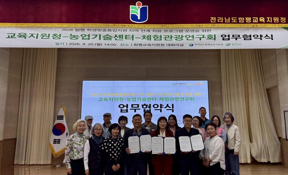 전라남도함평교육지원청(교육장 최은순)은 지난 4월 20일(월) 대회의실에서 학생맞춤통합지원 지역 연계 치유 프로그램 운영을 위한 ‘교육지원청-농업기술센터-체험관광연구회 업무협약’을 체결했다고 밝혔다.