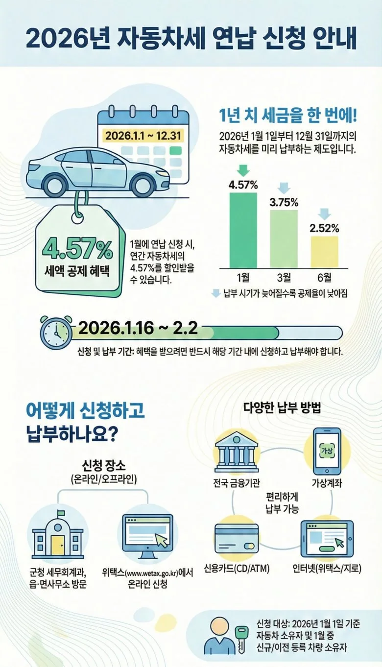 자동차세는 매년 6월과 12월 두 차례 부과되나, 1월에 연납하면 연세액의 5%를 공제받을 수 있어 안정적이고 확정적인 절세 효과를 누릴 수 있는 실질적인 생활형 재테크 수단이다.