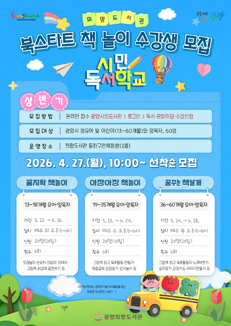 - 양육자와 함께하는 단계별 책놀이로 영유아 독서 습관 형성 지원 - 광양희망도서관은 ‘2026년 상반기 시민독서학교’의 일환으로 영유아 대상 ‘북스타트 책놀이’ 프로그램 수강생을 모집하고 있다. ‘북스타트 책놀이’는 영유아의 발달 단계에 맞춰 양육자와 아이가 함께 그림책을 읽고 오감 놀이를 체험하는 프로그램으로, 아이의 정서 안정과 언어 발달을 돕고 가정 내 독서 습관 형성을 지원하기 위해 마련됐다.