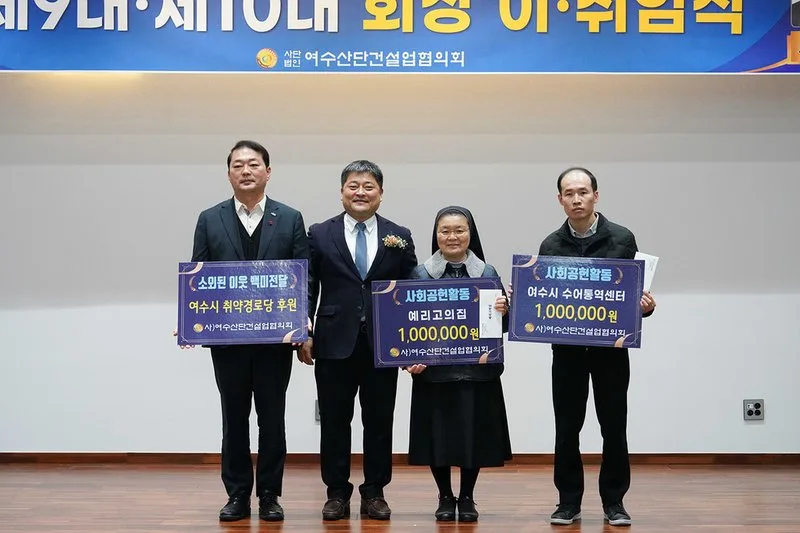 여수시는 (사)여수산단건설업협의회가 지난 22일 제9·10대 회장 이취임식에서 관내 취약 복지시설을 위해 후원금과 백미 등 약 1천 7백여만 원 상당의 후원금품을 전달하며 지역사회에 나눔을 실천했다고 밝혔다.