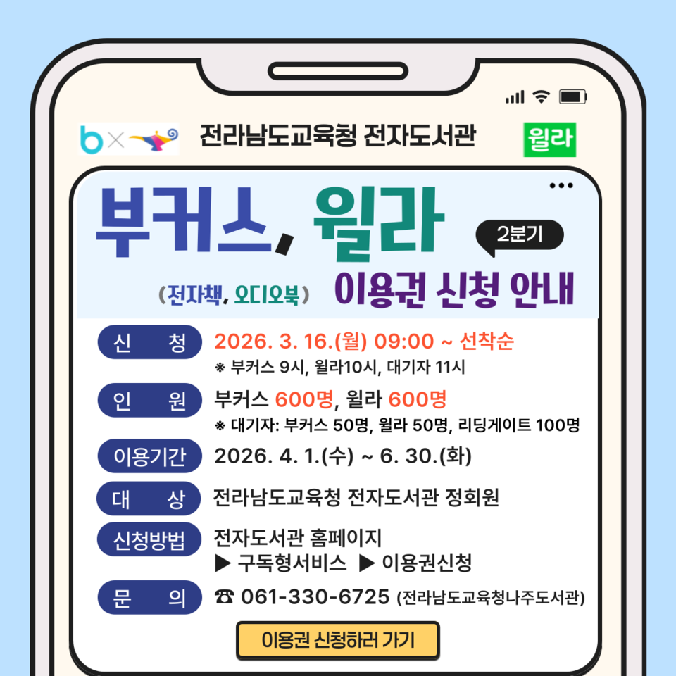 이번 서비스는 전라남도교육청 전자도서관 정회원을 대상으로 운영되며, 전자책 서비스 ‘부커스’와 오디오북 서비스 ‘윌라’ 이용권을 각각 600명씩 총 1,200명에게 제공한다.