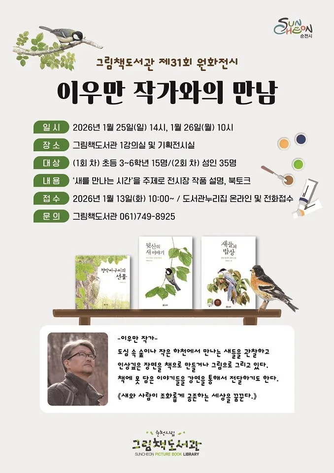 순천시는 제31회 그림책 원화전시와 연계해 생태 세밀화가이자 그림책 작가인 이우만 작가를 초청해 작가와의 만남을 운영한다.