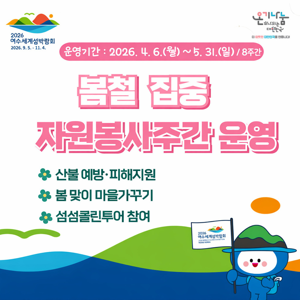 여수시는 4월 6일부터 5월 31일까지 8주간 ‘봄철 집중 자원봉사주간’을 운영하고 온기나눔 캠페인을 추진한다고 밝혔다.