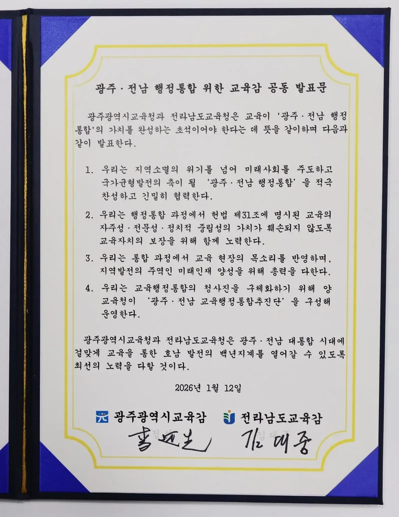 광주시교육청과 전남도교육청은 발표문에서 “지역 소멸의 위기를 넘어 미래 사회를 주도하고 국가 균형 발전의 축이 될 광주·전남 행정통합‘을 적극 찬성하고 긴밀히 협력한다”고 밝혔다.
