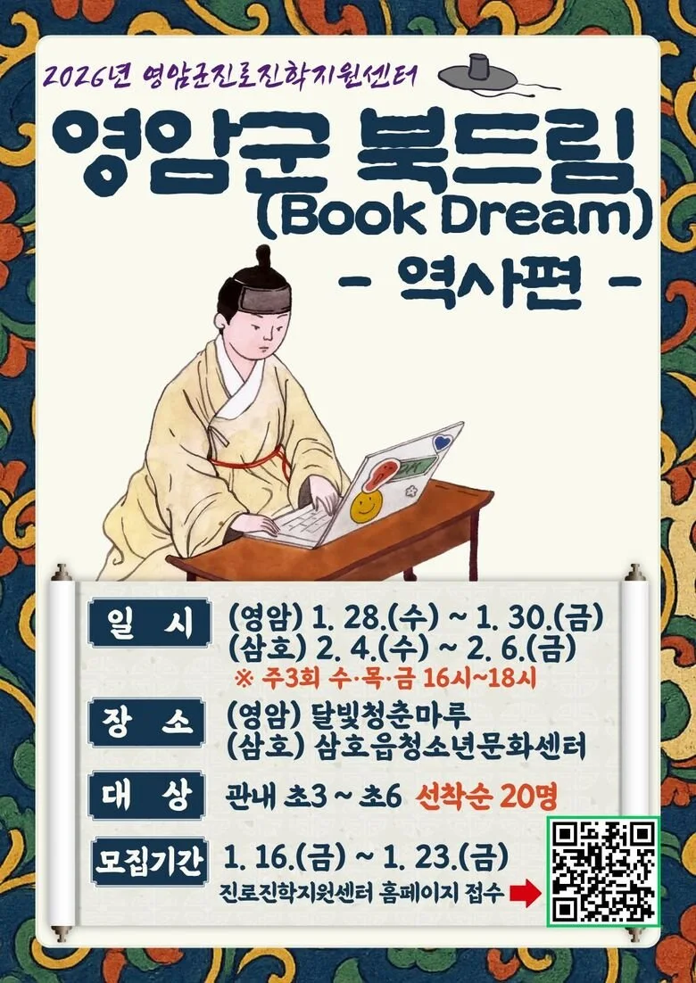 [제목: 영암군진로진학센터, 초등 3~6학년 북드림 참가자 모집] 본문: 영암군진로진학지원센터가 겨울방학을 맞아 초등학생의 사고력과 표현력을 키우는 독서토론 프로그램 ‘영암군 북드림-역사편’ 참가자를 이달 23일까지 모집한다.