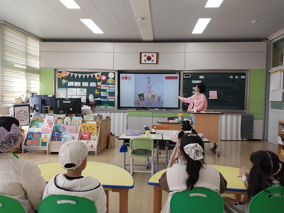 특히 저학년 학생들이 자연을 친근하게 느끼고 감수성을 키우는 데 중점을 뒀다. 1교시에는 백유연 작가의 ‘벚꽃팝콘’을 함께 읽으며 봄의 이미지를 상상했다.