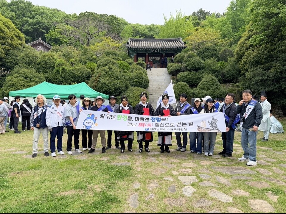 전라남도여수교육지원청(교육장 백도현)은 28일 충무공 탄신일을 기념해 여수여해재단이 주관하는 ‘이순신 참배길 걷기’와 연계하여 여수 시민들과 함께 공직자의 청렴 의지를 다지고, 지역 환경을 정화하는 플로깅 활동을 실시했다.
