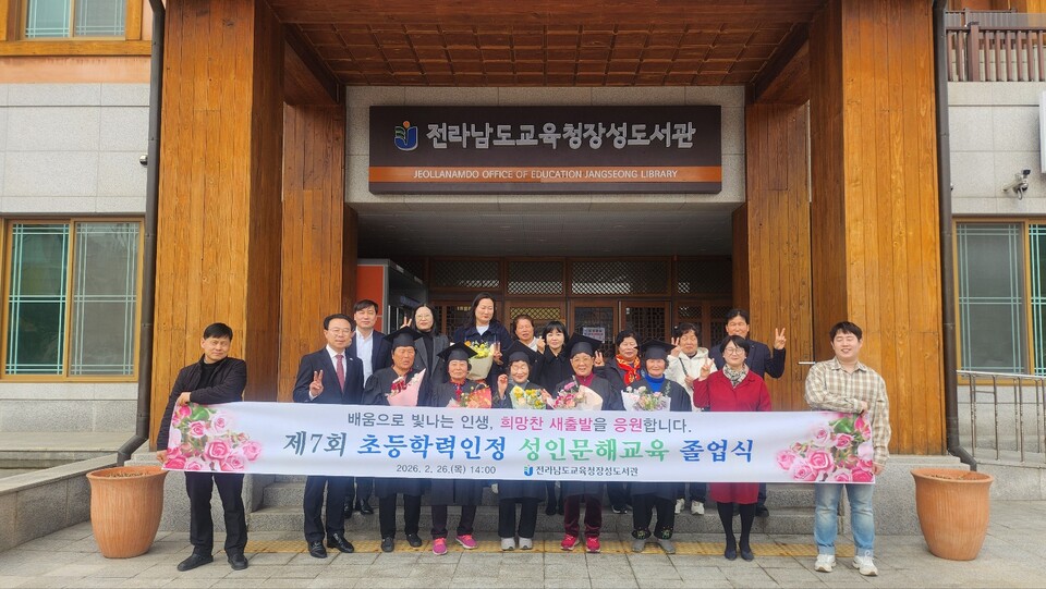 전라남도교육청장성도서관(관장 차계옥)에서 2월 26일 제7회 초등학력인정 성인문해교육 졸업식을 열고 새로운 출발을 축하했다.