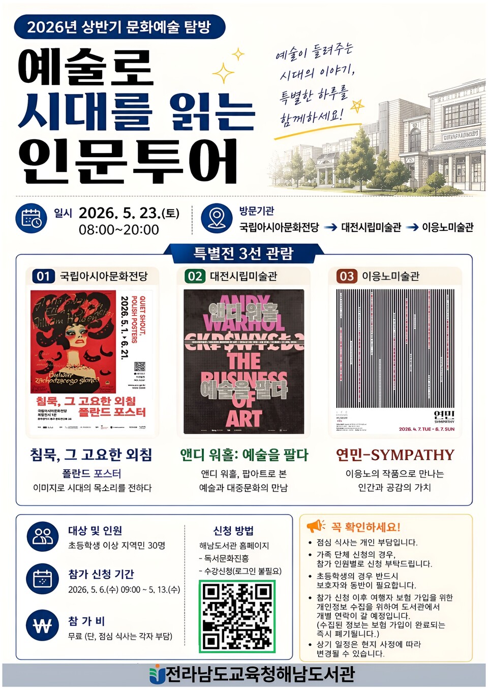 전라남도교육청해남도서관(관장 박은정)은 오는 5월 23일 토요일 초등학생 이상 지역민 30여명을 대상으로 2026년 상반기‘예술로 시대를 읽는 인문투어’를 운영한다고 밝혔다.