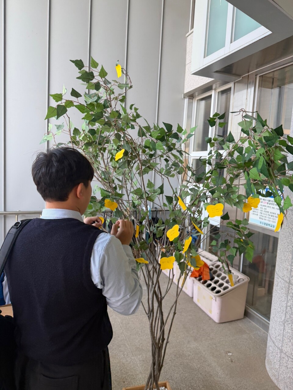 학생자치회는 나비 모양 포스트잇을 나누어 주고, 학생들은 “나는 ○○ 안전수칙을 지키겠습니다”라는 문장을 작성해 나무에 걸었다.