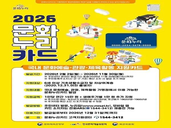 문화누리카드는 문화예술·국내 여행·체육활동 이용을 지원하는 제도로, 2026년에는 지난해 대비 1만 원 인상된 연간 15만 원이 지원된다.