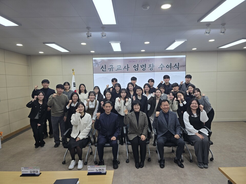 전라남도무안교육지원청(교육장 김보훈)은 2026년 3월 9일(월) 무안교육지원청 대회의실에서 2026. 3. 1.자 유치원·초등학교·중학교 신규교사 36명을 대상으로 임명장 수여식을 개최하였다.