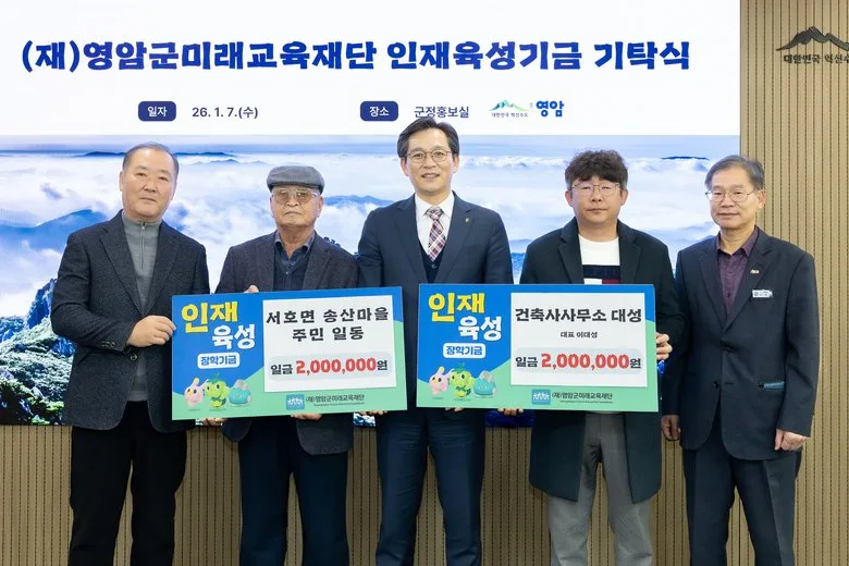 영암군 서호면 송산마을 주민들이 지역 인재 육성 장학금 200만원을 영암군미래교육재단에 기부했다.