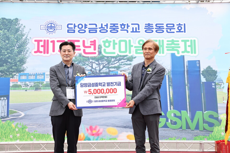 담양금성중학교(교장 강대인)는“모교 발전을 위해 변함없는 애정과 관심을 보내주시는 총동문회에 깊은 감사를 드린다”며 “동문 선배님들의 소중한 뜻이 학생들에게 잘 전달될 수 있도록 교육 활동에 최선을 다하겠다”고 화답했다.