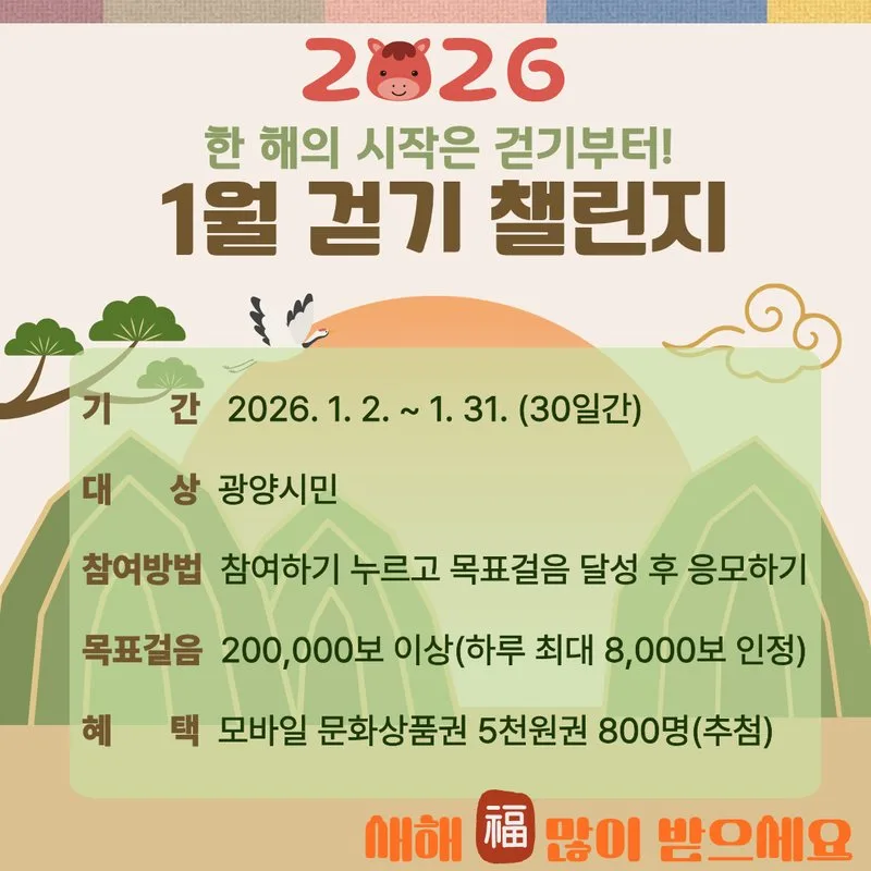 반미순 건강증진과장은 “새해 건강은 매일의 꾸준한 실천에서 시작된다”며 “1월 걷기 챌린지를 통해 새해부터 한 걸음씩 건강한 생활을 실천하길 바란다”고 말했다.