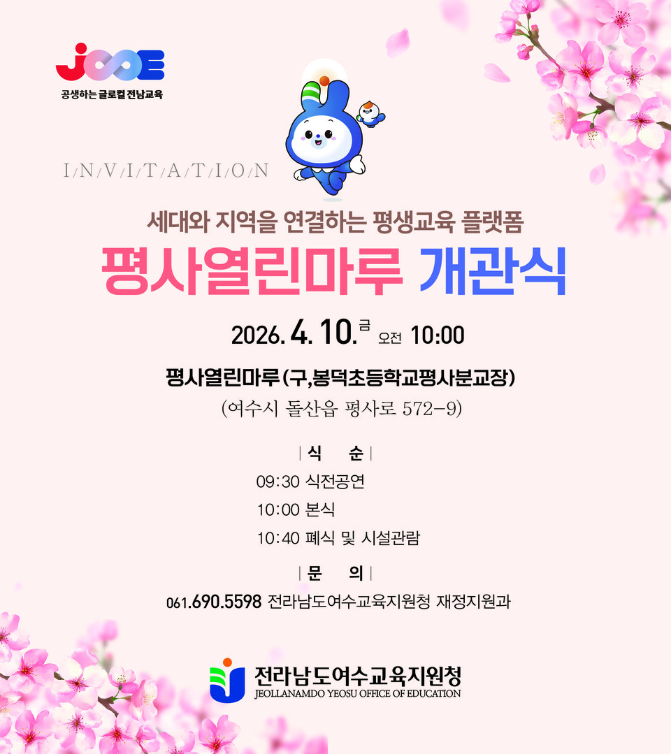 전라남도여수교육지원청(이하 여수교육지원청)은 오는 4월 10일, 폐교된 (구)봉덕초등학교 평사분교장을 리모델링하여 조성한 복합문화센터 ‘평사열린마루’의 개관식을 개최한다고 밝혔다.