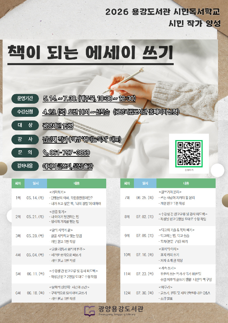 수강 신청은 4월 23일 오전 10시부터 시작되며, 글쓰기에 관심 있는 광양시민이면 누구나 참여할 수 있다.