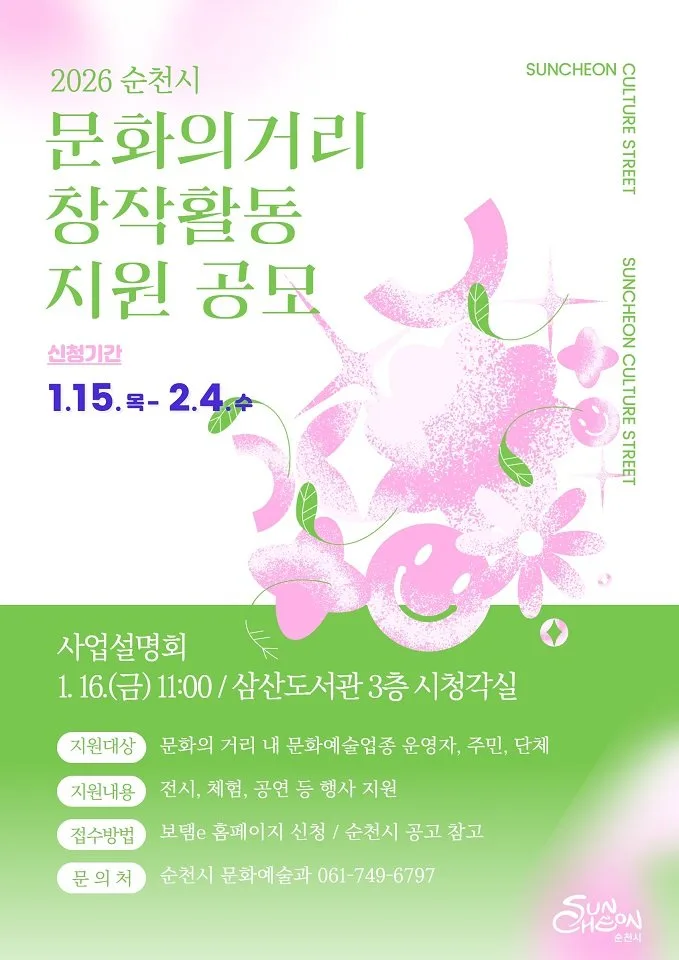 순천시는 문화의 거리를 예술특화 거점지역으로 육성하고 지역 예술인의 지속가능한 창작활동을 지원하기 위해 '2026년 순천시 문화의 거리 창작활동 지원사업' 참여자를 공개 모집한다고 밝혔다.
