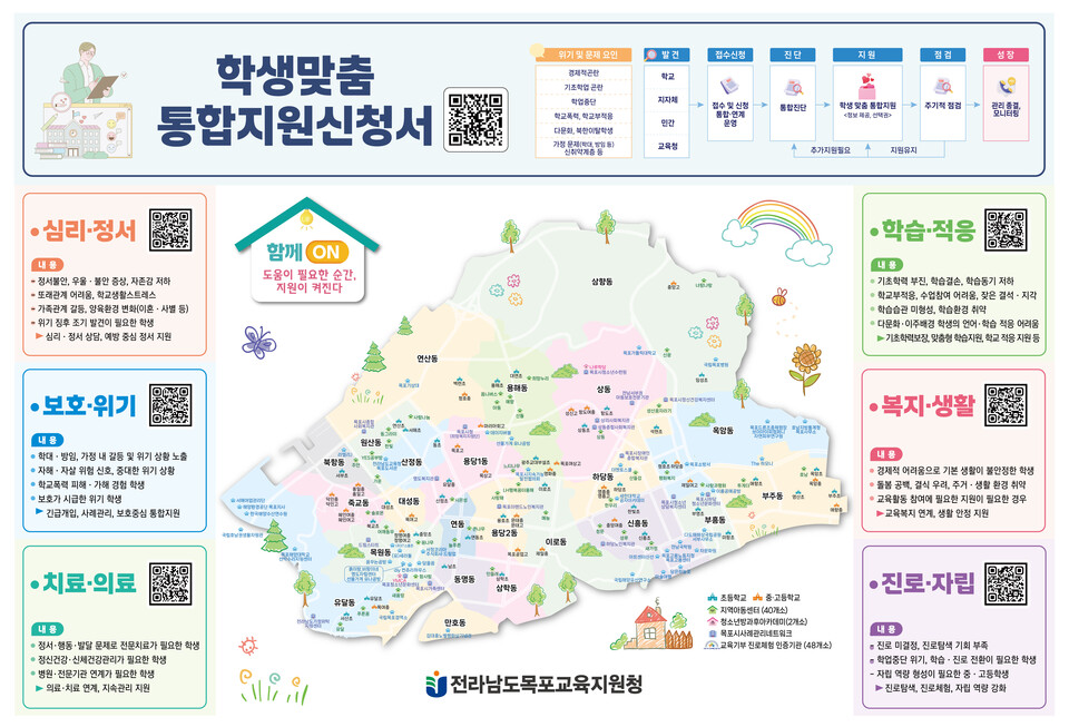 전라남도목포교육지원청(교육장 박재현)은 2026년 「학생맞춤통합지원」전면 시행에 따라 학생 개별 상황에 맞는 지원을 보다 신속하고 체계적으로 연결하기 위한 ‘지역 자원 지도’를 구축·배포했다고 밝혔다.