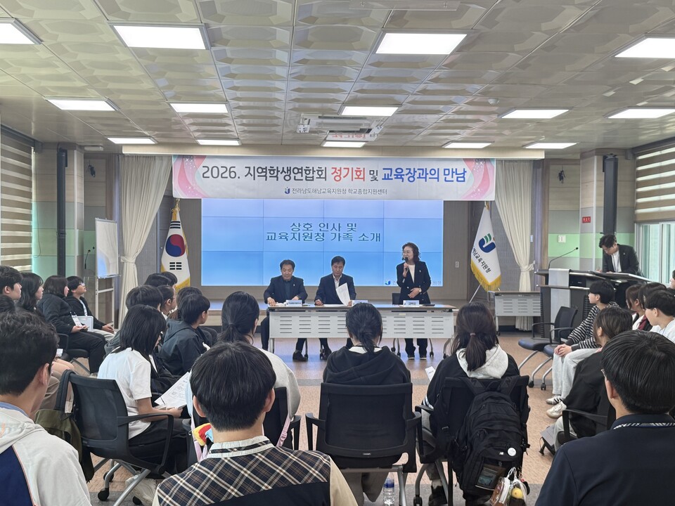 전라남도해남교육지원청(교육장 조연주)은 4월 16일(목) 교육지원청 대회의실 및 연수실에서 관내 초·중·고 학생 대표와 자치 업무 담당 교사들이 참여한 가운데 ‘2026학년도 상반기 지역학생연합회 정기회’ 및 ‘업무 담당자 역량 강화 연수’를 성황리에 개최했다.
