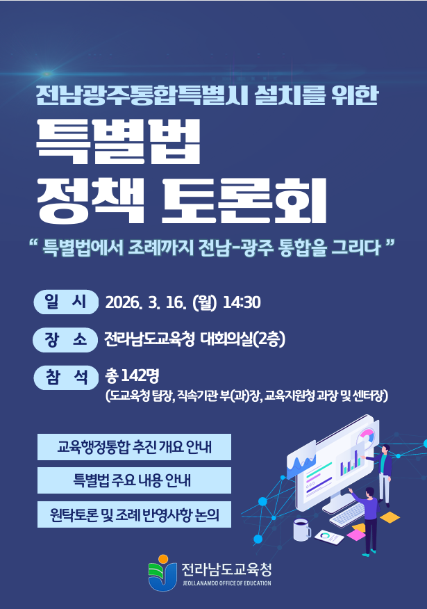 전라남도교육청은 오는 16일(월) 청사 대회의실에서 ‘특별법에서 조례까지, 전남·광주 교육행정통합의 제도적 기틀을 그리다’를 주제로 정책토론회를 개최한다.