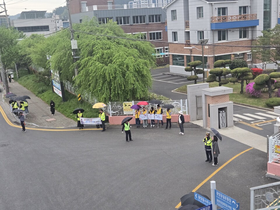 학부모회와 지역 단체 ‘교육사랑’ 회원들은 우천 속에서도 교문 앞에서 학생 한 명 한 명의 눈을 맞추며 반가운 인사를 건넸다.